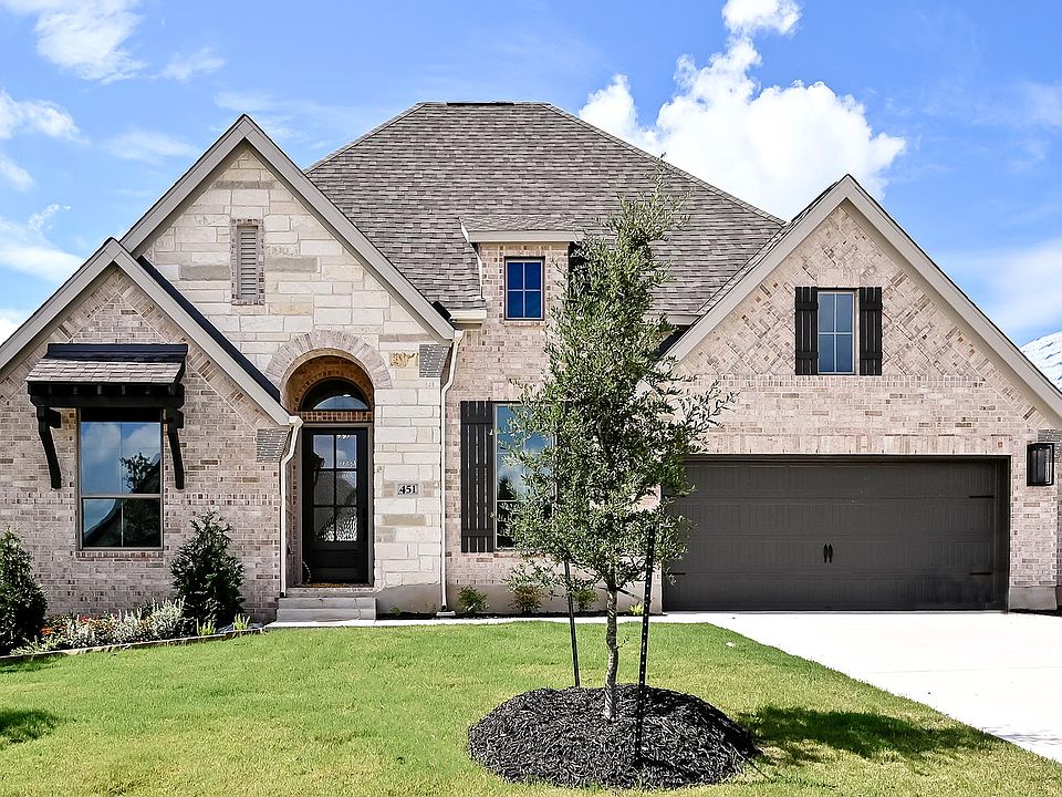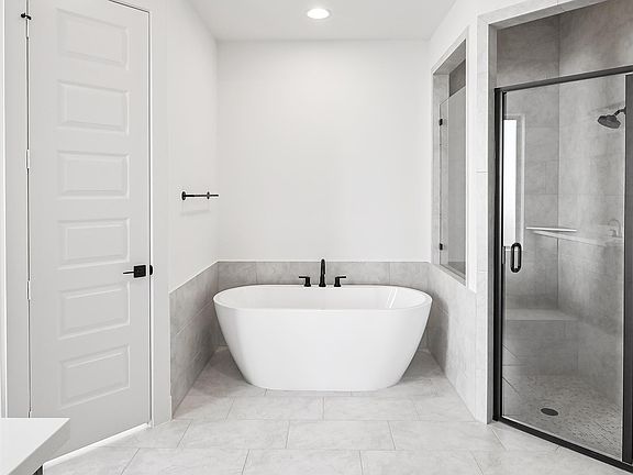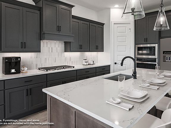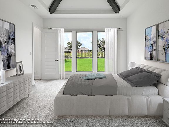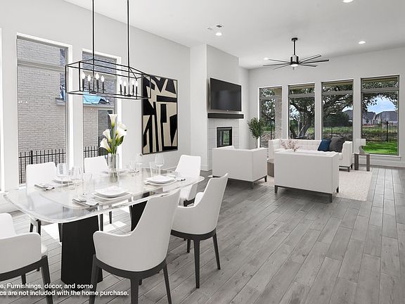 Home office with French doors set entry. Media room with French doors off extended entry. Formal dining room flows into open family room with a wood mantel fireplace and wall of windows. Kitchen features corner walk-in pantry, 5-burner gas cooktop and generous island with built-in seating space. Adjoining morning area features a coffee bar and wall of windows. Primary suite includes double-door entry to primary bath with dual vanities, garden tub, separate glass-shower and two walk-in closets. Guest suite offers private bath. High ceilings and abundant closet space add to this spacious four-bedroom design. Extended covered backyard patio. Mud room off three-car garage with additional garage bay space. Representative Images. Features and specifications may vary by community.