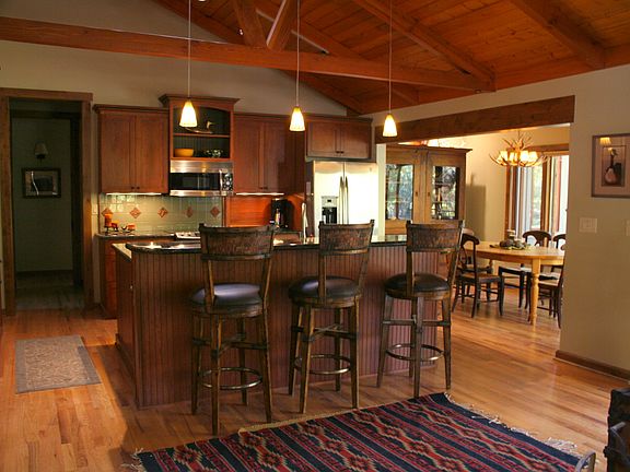 Perched over the confluence of Munds and Oak Creek with 30 ft of creek front deck. High end finishes, beamed vaulted ceilings, hard wood floors, a large private deck for each of the bedrooms as well as ensuite bathrooms.
