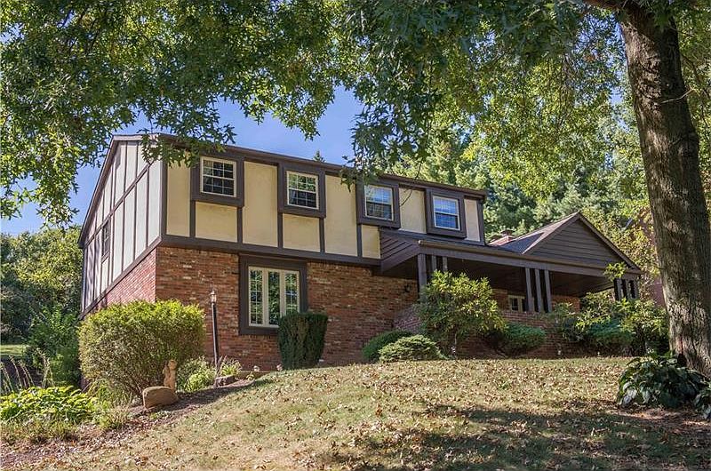 This stately, Tudor-style home on a cul-de-sac street in the award-winning Upper St. Clair School District offers 4-bedrooms, 2.5-baths and side-entry 2-car garage. It is in a great location, convenient to outstanding shopping, dining, recreation, and a sitting park. The spacious, welcoming covered front porch adds to the already abundant curb appeal. Twin porch lights flank the beautiful leaded glass entry door. The foyer is tiled and has a guest coat closet and powder room. The large, formal living room has a bay window overlooking the front of the home, hardwood floors, and neutral wall tones. A window facing the back of the property is the source of natural light in the dining room, which is separated from the kitchen by a breakfast bar offering casual seating. The kitchen is fully equipped with a double pantry, dishwasher, gas cook top, convection wall oven, refrigerator, and disposal. A door off the kitchen opens to the covered rear patio, making outdoor grilling and dining a breeze! There is a rustic charm in the family room, offering a brick fireplace, beamed, vaulted ceiling, hardwood floor, and a large picture window. The laundry room is conveniently located on the main level and is accessed from the family room. It has a double storage closet, built-in open shelving, tile floor, and window facing the back of the home. There is also access to the rear patio from the laundry. The master bedroom suite measures a sizable 16x12 and offers easy-to-match wall tones, hardwood floor, and a wall of closets. The master bath has a step-in shower with built-in seat. Bedroom two is nearly as large as the master and has two double closets. Bedroom three has a hardwood floor and a spacious double closet. This bedroom is just off the stairs to the upper level. Cozy bedroom four has hardwood flooring, a nicely sized closet, and a laundry chute. The main bath in the hallway is fully tiled and has a combination tub and shower and wide vanity with storage. Stairs off the kitchen lead to the lower level. The finished area offers a host of built-in cabinetry, making it an ideal spot for a home office or craft room. There is also a large, unfinished room on this level, as well as the entrance to the garage. The rear yard is tiered, with steps between levels. The level upper portion of the yard is outfitted with a storage shed which remains with the sale. The home is outfitted with a security system and a home warranty is also offered.