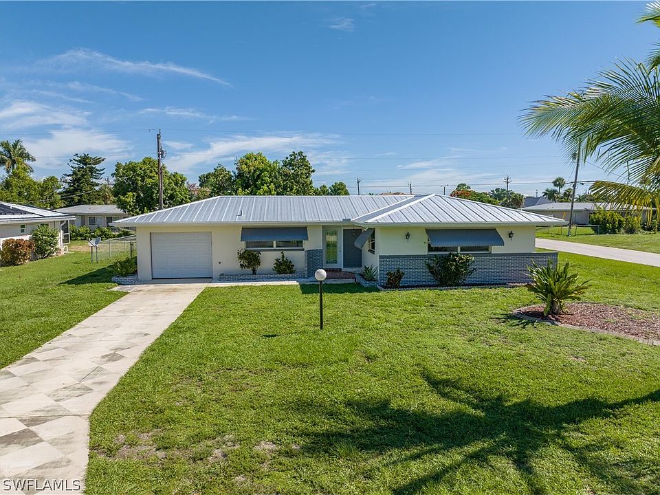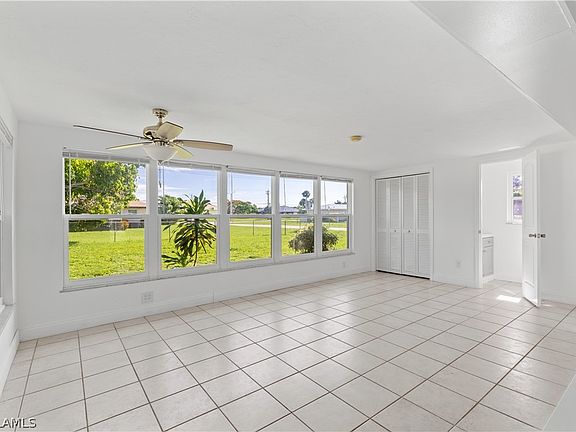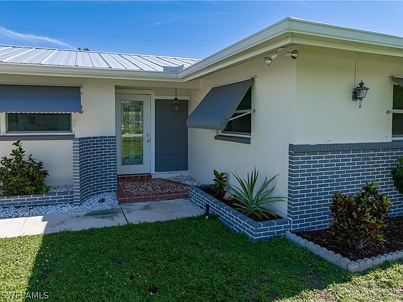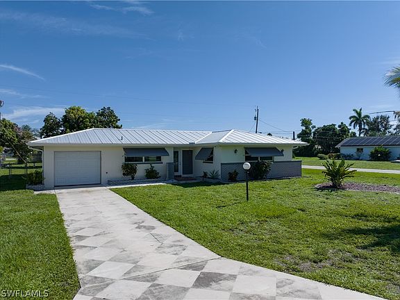 Located in the highly desirable area of SW Cape Coral, this home offers a large corner lot in a quiet neighborhood a few minutes’ drive to the Caloosahatchee River along with easy access to shopping, dining and entertainment. Exterior home highlights include a metal roof, clam shell awnings, a lovely, landscaped lawn and a fenced rear yard including a Honey Mango tree. The interior offers a light color palette, tile floors throughout, an open great room floor plan with spaces for dining and relaxing. A large multi windowed sunroom off the main living area is a great bonus space with a half bath and screened lanai access. The updated kitchen includes white, raised panel cabinets, granite counters and tiled backsplash. New appliances complete the look. Both bedrooms offer an abundance of light, tiled floors and double door closets. The primary bedroom offers an updated bath with shower and pedestal sink. The guest bath includes a large vanity with granite counter and an updated tiled tub and shower. As a perfect vacation/staycation or for the first-time buyer, this home is a must see! It has so much potential as in room for a pool to make it your own!