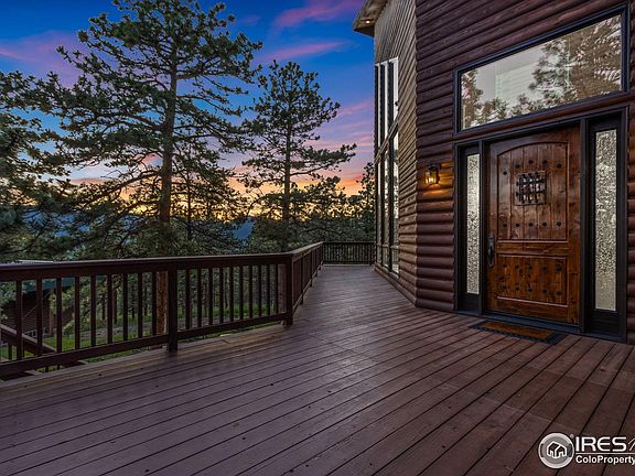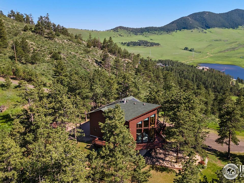 Set on 10 acres of land surrounded by towering pines, this custom log chalet is the ultimate retreat with panoramic views of Longs Peak and overlooking Pinewood Lake, offering a one-of-a-kind getaway in a truly special setting. Lovingly cared for by its owners over the years, this home has seen thoughtful updates while keeping all the charm of a true mountain chalet-everything is ready so you can enjoy the space right away. Intricate woodwork and classic accents add personality and warmth in every corner, while complementing the home's unique architecture. High ceilings and large picture windows create an immediate "wow" effect, while a floor-to-ceiling stone wall serves as the living area's centerpiece, complete with a fireplace that welcomes quiet evenings. The kitchen is rustic-modern perfection with black appliances, granite countertops, and a pantry. The main floor primary suite connects to a shared ensuite bath, offering easy comfort and quick access to the heart of the home. Upstairs, the 2nd bedroom and airy loft feel like a getaway of their own, featuring a wood stove and access to a private balcony that make this space ideal for guests, reading, or even a work-from-the-mountains setup. Downstairs, the walkout basement turns into your personal hangout zone, complete with a dry bar, a 3rd bedroom, and enough space for easy entertaining. Outdoor living is effortless with a wraparound deck and covered patio surrounded by nature. Enjoy coffee while watching wildlife wander by or take in stunning sunset views. The 36x40 garage provides all your parking needs with enough space for hobbies, projects, or a creative studio. A separate shed provides additional storage for gears, while installed solar panels allow for a sustainable lifestyle. Enjoy nearby Ramsay-Shockey Open Space and Pinewood Reservoir, with access to fishing, paddle boarding, camping, hiking, and more. A truly unique mountain home in a prime location, with unbeatable views and unmatched serenity!