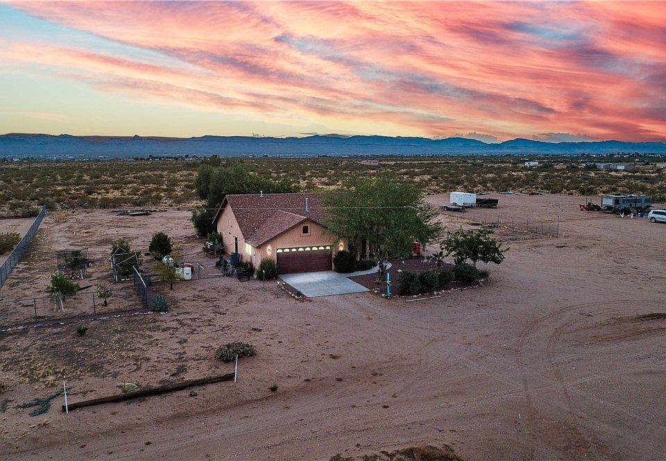 WELL KEPT 1592 SF LIVABLE SITE BUILT HOME WITH A LARGE OVERSIZED 643 SF FINISHED GARAGE*BUILT IN 2006* PERFECTLY SITUATED ON A 1.03 ACRE LOT*BRING THE PONIES, CHICKIES AND PUPPIES AND MAKE THIS YOUR HOME* 8 FRUIT AND NUT BEARING TREES* Property is NOT WATER HAUL regular water service*Prroperty has gorgeous mountain views that will capture your attention for hours*Perfectly situated on a 1.03 acre lot in Golden Valley, Arizona*Nestled in the serene open valley between the rolling Black and Cerbat Mountains, this property hosts of all the benefits and tranquility only rural Arizona can provided* Short distance off paved Colorado Road* RV parking * Property is cleared, well-manicured and ready for you to call home*Rest and Relax on your front patio in the morning with a cup of coffee and watch the amazing Arizona sunrise coming up over the mountains**Entering you will find a spacious living room with vaulted ceilings, light/fan, pot shelves, well cared for carpet & large view windows*dining area off the kitchen with natural lighting, wood laminate flooring, sliding glass door to rear patio* spacious kitchen with plenty of cabinets, quality countertops, stainless steel double sided sink with view window over sink, food pantry, electric stove/range oven, dishwasher & refrigerator** King-size owners suite with 2 closets (1)walk-in*owners on-suite bathroom with a large vanity, dual sinks, a tub/shower combo** the split bedroom floorplan offers quiet evenings after a busy day with 2 full size guest bedrooms and full size guest bathroom*In-door laundry*Enjoy the rear covered patio* fenced in area*cool green grass and a large raised deck for your hot tub***The mature fruit and nut trees include (2 orange-1 fig-1 peach-2 almond & 2 plums) Low Taxes $1058 a year*NO HOA*Golden Valley is a suburb of Kingman and Bullhead City, this home offers the convenience of these bigger cities but still having the small town atmosphere* You'll appreciate the open space for evening relaxation, awesome BBQs and amazing sunsets*The beautiful birds chirping may be the sound you hear every morning when you wake up* *30 minutes to Laughlin Nevada Casinos, Lake Mohave & Colorado River*15 miles to shopping and hospital** Whether you enjoy ATVs, equestrian activities, gardening, hiking, or exploring the local historic sites, this area has it all