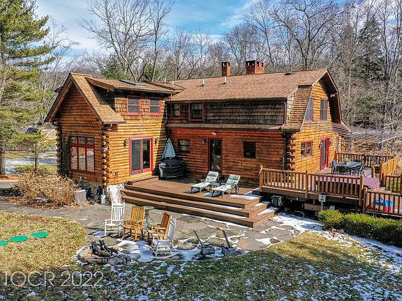 This Custom Vermont Log Home is truly an Oasis. Vacation all year w/peaceful and serene views of your own pond and picturesque property from the front porch or deck. Set back off Stonetown Rd on just under 2 acres of privacy, this home is truly one of a kind, having the charm of cabin living w/all of today's modern amenities! Upon entry, a welcoming foyer leads to an open concept formal living and dining room w/ wood burning stove. Country kitchen with stainless steel appliances, farm sink, island, sitting area w/wood burning fireplace and dining area. Second floor Master Suite features a large WIC and full bath, three additional bedrooms and full bath complete second floor. Finished basement w/ family room and 1/2 bath. 2 Car attached garage. Storage. Central A/C. Beautiful large rear deck with Hot Tub. - Basement: FR, PR, 2 CAR GARAGE, STORAGE