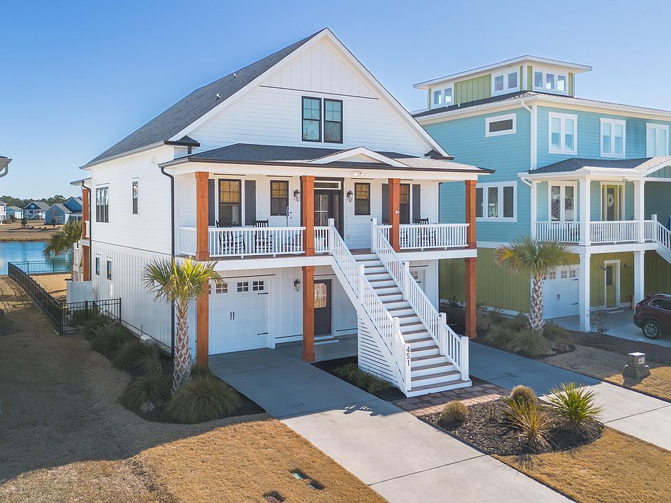 Luxury living awaits at Summerhouse on Everett Bay. 451 Summerhouse Ln epitomizes the coastal living experience with rare amenities and a community-based lifestyle that is unlike any other gated-community in our area. Featuring the most premium features and finishes that modern construction offers. Reeves Custom Homes put extra attention into this floor plan. With 4 bedrooms and 3 full baths with one half bath, you'll have room to stretch out. Including a ground-level guest suite and family room that can serve as a flex space for your desired purpose, this is the space you've been dreaming to design and make your own. The main living area upstairs is open-concept with a waterview. Coffee sunrises with water views can be seen from the main living area, expansive covered porch as well as the primary suite. With custom built-ins and a fireplace, the living room is highlighted by a custom accent wall that adds to the decor and coziness while not losing any of the open feel. The primary suite, conveniently and inconspicuously located just off the main living and kitchen areas. Oversized and spacious with access to the recently upgraded TREX porches. Just past the walk-in closet is the washroom complete with tiled shower and soaking tub. This is your retreat for a spa-like experience. The dining area and chef's kitchen offers the opportunity to host a crowd or enjoy an intimate meal with views of the water. Highlights include granite counters with a textured, leathery feel, stainless steel appliances, an oversized island with a microwave drawer. and custom built-ins framing the fireplace. The community of Summerhouse on Everett Bay is unlike any other. Considered one of the largest resort-style pools in southeast NC, private boat ramp/day docks with access to the Intracoastal Waterway. Clubs and calendars offer options to be as social as you'd like to be. A fitness center, tennis and pickleball courts, hiking trails and sidewalks make this a gem of the NC Coast.