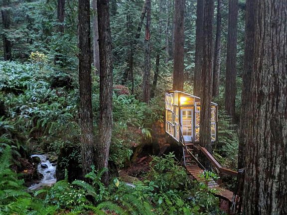 Enchanting Creekside Retreat with Treehouse and Seasonal Waterfalls. Step into your personal paradise, nestled within the heart of Fieldbrook's lovely embrace. Far more than just a dwelling, this property stands as a rare treasure, a thriving investment, and a unicorn within the realm of real estate possibilities. Situated on nearly 10 private acres of secluded redwood forest, a gated haven greets you with a custom 4br/2ba main home (2,608 SF) showcasing masterfully crafted old-growth redwood finishes, expansive windows, knotty larch ceilings, oak hardwood flooring, an open floor plan with chef's kitchen, and a wheelchair-accessible wrap-around deck with 6-person hot tub. The entire compound has flourished as a licensed short-term rental since 2018. Adjacent to the main home awaits a charming studio mother-in-law cottage, complete with full kitchen and bath, ideal for accommodating guests or generating supplementary income. A captivating treehouse terrace, perched 80 feet above a creek and lush fern grotto, offers sunset panoramas and sweeping forest views. Savor the luxury of pristine water sourced year-round from the springhead, flowing into a 34,000-gallon potable holding tank, its purity ensured by a threefold filtration system. In the private valley below, two creeks converge in a breathtaking confluence, featuring two detached creekside cabins, a charming bath house, and two separately enclosed gardens. A raised wooden pathway leads to a glass-enclosed, electrified treehouse, poised above a seasonal waterfall. Additional opportunities for income beckon. A modernly restored 1967 Airstream rests amidst 20+ year old apple trees and a new deck on its own sunny landing. This and a separate pull-through campsite both boast reclaimed grain silos featuring bathroom amenities.
