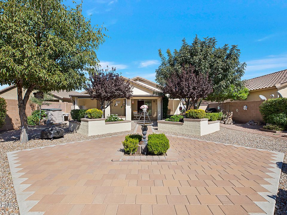 If you love relaxing in your backyard, this home is for you! Immaculately landscaped with $25k in improvements, it's an oasis that is the envy of the neighborhood with pavers, tri-level planters, mature bushes and trees and a lovely birdbath! The home offers a large great room, with custom shelving, and vaulted ceilings. The eat-in kitchen has beautiful maple cabinets, a large island breakfast bar, and plenty of storage. The split bedrooms are spacious with ceiling fans and neutral paint. The home also has an 8ft RV style gate with pavered access to the backyard and the additional storage space of two shed, both of which convey. Located on a cul-de-sac and just a short walk to Empire Park and close to San Tan Valley and Queen Creek shopping.