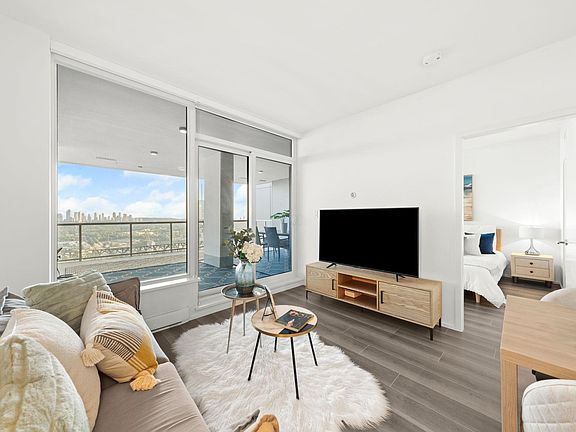 Floating above the cityBreathtaking south-facing viewsGas hookupSleek cabinetryCustom drawersIsland with built-in diningWalk-in closet
