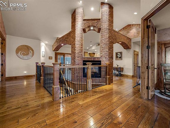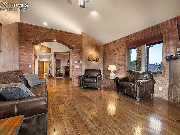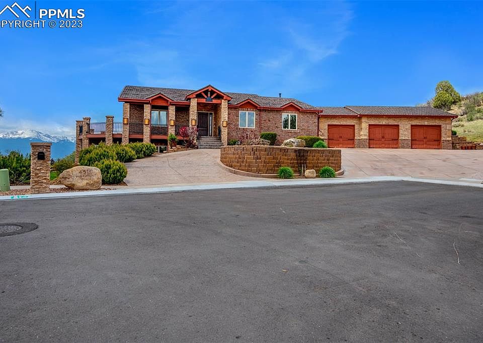 Sitting high on Sunset Mesa is this incredible walkout ranch with panoramic MOUNTAIN VIEWS, twinkling CITY LIGHTS, and PRIVACY! Built to withstand the elements, this home features a solid masonry exterior of brick and stone, plus a Decra roof of stone coated steel tiles. Upon entering, you are greeted with dramatic brick arches, hand troweled walls, wide plank hardwood floors, rustic alder doors/molding, and 3 gas fireplaces. The main floor primary bedroom and 5-piece bath have a walkout to the huge view deck, as do the living room and the heated sunroom. The earth-toned modern kitchen faces protected open spaces and features granite slab counters and high-end KitchenAid stainless steel appliances. Also on the main floor are a dining area, 2 additional bedrooms, 3 more bathrooms, and a large laundry room. At the entry, a wide decorative staircase takes you to an ENTERTAINERS’ DREAM lower level. Here, a floor-to-ceiling rock fireplace is the cornerstone of a welcoming media area. From there, hand troweled walls, paired with rock and brick faced walls, serve as a backdrop for the immense gathering areas that can easily accommodate pool, shuffleboard, darts, karaoke, a piano, etc., plus card, dining and buffet tables! The immense wet bar, with 21 feet of live edge pine slab counters, draws everyone in for refreshments to be served from the glass-doored commercial refrigerator! Also included in the lower level is a massive walk-in safe, an ensuite bedroom, and another bath. Stepping out to the patio, your guests will be awed by the mountain views that frame the built-in gas fire pit and the grand built-in gas barbecue. Heading back upstairs to the main level patio, be equally impressed with the deluxe 7-person spa with adjacent built-in gas fire pit. For the hobbyist, find an oversized 3-car garage that is heated & has epoxy finished floors. hardwired security system. As a final plus, this view home has EASY ACCESS to Powers Blvd, hospitals, and grocery/outlet stores!