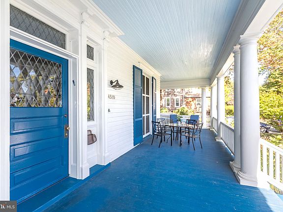Welcome to 4510 Roland Avenue—a true Roland Park gem. From the expansive wrap-around porch to the unique red slate roof, from the 10-foot ceilings to the exceptional layout, this is an extraordinary home. Entering through the front door with its original leaded window you will be greeted by refinished oak floors with mahogany inlay. The grand foyer with wood-burning fireplace is bordered by working pocket doors, leading to spacious living spaces. The formal dining room with its decorative fireplace and French doors to the porch will host many memorable meals. It opens to the large sunny kitchen with carefully restored cabinets, new marble countertops, and hardwood floors. A new chef's dual fuel range and hood make cooking in this space a pleasure. An enclosed porch just off the kitchen is perfect for a morning cup of coffee. How handy is the connecting laundry room/pantry right behind the kitchen? The library features custom built-in cabinetry and floor-to-ceiling bookcases with a rolling library ladder. French doors lead to the porch making a wonderful circular flow for entertaining on beautiful days. When the days turn wintry you will welcome the warmth of the wood-burning fireplace. The library connects to the formal living room (or spacious family room) with a large leaded bay window and corner fireplace—plenty of room for large gatherings! Head up the grand staircase to the landing with a wide window seat—a cozy spot for puzzles, reading, or game night. Up a few more stairs is the broad center hall of the second floor. Four bedrooms, or three bedrooms and a master suite, plus an office/nursery open off the hall. The brand-new primary bath offers vintage style and updated luxury. The other bath on this level is recently renovated. Custom hardwood floors gleam throughout these ample rooms. There’s also an enclosed porch with a view of the garden—ideal as a sunroom, office, or yoga studio. The third floor provides an enormous office/family room/exercise room, or whatever you wish, plus two bedrooms and a renovated bath. The back yard is a fully fenced private oasis that includes a brick pathway and patio underneath a pergola, a formal herb garden, mature trees, and shrubs plus a flat lawn. The garage, large enough for two cars plus plenty of storage, opens to the yard as well as the alley. This well-tended home has only known four owners in its 116-year history. The house is a short walk to all that the neighborhood has to offer—schools, community pool, library, restaurants, coffee shops, grocery stores, and more. Just a few minutes will get you to 83 for those who commute by car or train. This house is all that people looking to live in Roland Park hope to find and more!