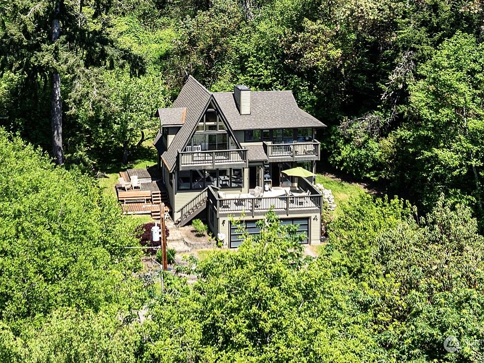 This secluded Northwest Contemporary is nicely sited on nearly an acre of land at the end of a private road, offering sound and mountain views and deeded beach access. The main level features open concept living and dining spaces, a new gas fireplace, an updated kitchen, a den, a full bathroom and access to a large deck ideal for entertaining. Three bedrooms and two bathrooms are located upstairs, including a primary suite with a view balcony. A family room on the lower level could easily flex as a fourth bedroom. System updates include an on-demand hot water heater, a newer heat pump with air conditioning and a newer roof installed in 2021. The property also includes an attached two car garage with shop space and a storage shed.