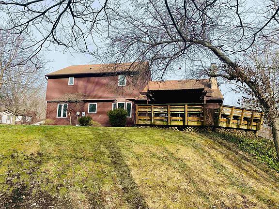 Great price for As-Is sale and chance for you to update to your taste! Huge rolling wooded site and meandering creek along the side ravine. Assoc park area with river access. Separate LR and FR. New vinyl windows & patio door in last few yrs. HUGE MBR and 4th BR over garage! Ceiing/Flr brick face FP in FR. Crown molding in LR and DR. Neutral carpeting. Real wood oak cabinets, desk area, pantry and good countertop area. Basement has 2 rooms with over half semi finished. Deck and built in seating to rear. Gas & elec dryer hook ups. Pegboard and cabinets in garage w/pull down attic. Newer GFA and CA. Ready for you to update to your personal taste and basement has great potential. Owner will also consider renting (grandfathered rental).