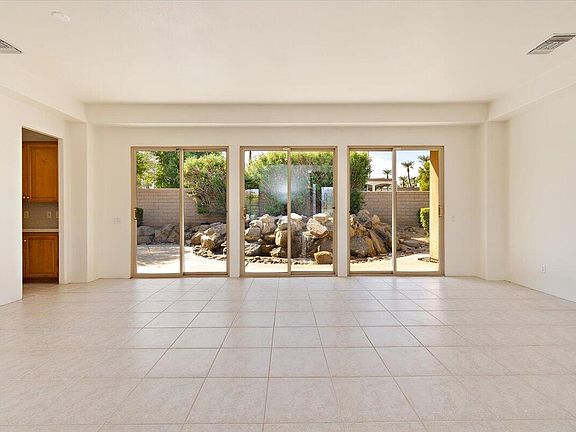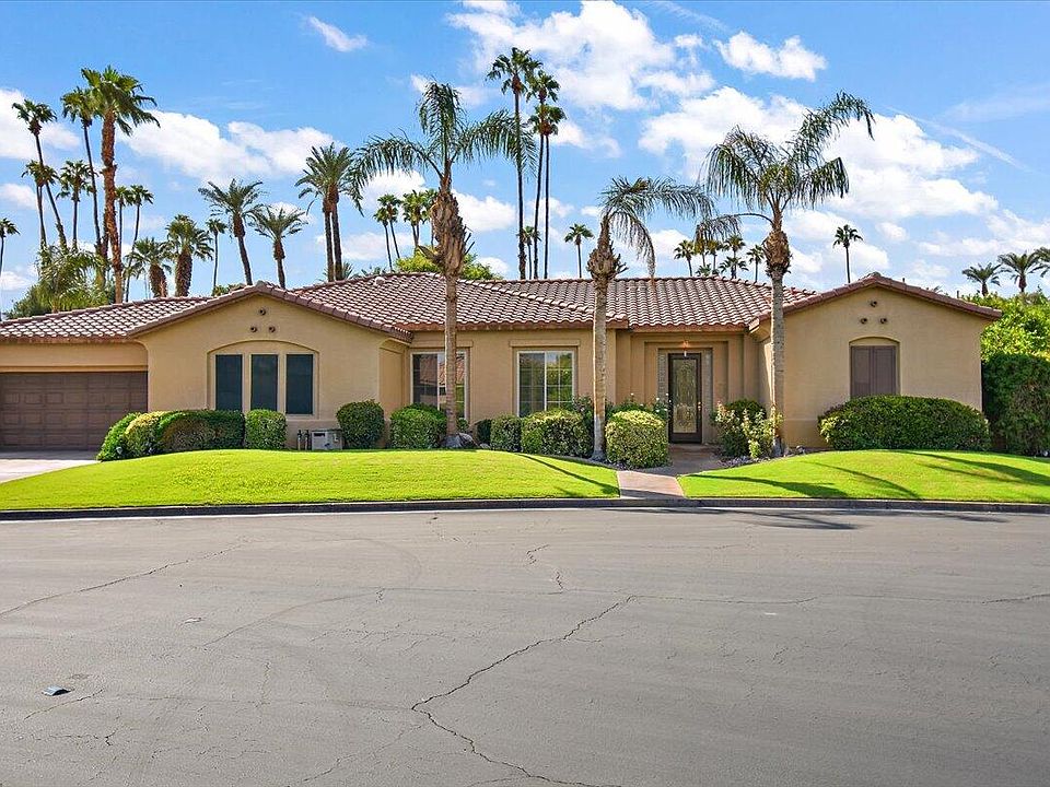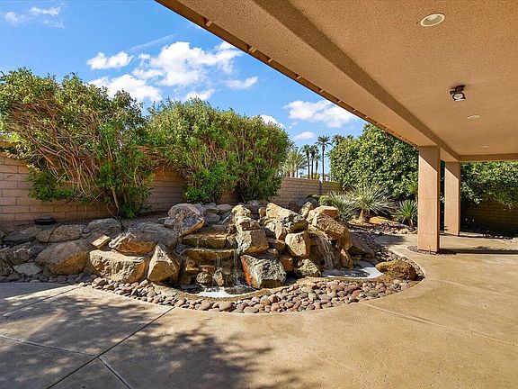 WELCOME HOME to the most favorably priced beautiful home (with low HOA) in the heart of Indian Wells in the highly desirable gated community of Sundance. Newly painted, the home boasts 2,245 sq. ft., with 3 bedrooms 2 full baths, and powder room on generous 10,890 sq.ft. beautifully landscaped lot with south and west facing mountain views. The home has high ceilings and a gracious entry into a large formal living room and dining area boasting floor to ceiling windows and sliders looking out to the private back yard. The spacious primary bedroom and bath features a newly renovated marble walk-in double shower, double sinks, and a large walk-in closet. The 2-guest bedrooms share a 4-piece guest bath (one ensuite) and there is a private office (which could be a 4th bedroom), off the laundry room. The generous kitchen with island seating opens to the breakfast area and large family room with fireplace. Recent upgrades include a new hot water tank (2022), 2 new HVAC motors (2020 & 2021), and double ovens (2016). Enjoy the dramatic water fountain on the back patio with space to BBQ, dine and enjoy the mountain views and citrus trees. There is a large attached 2-car garage with generous storage. The home is a MUST SEE!