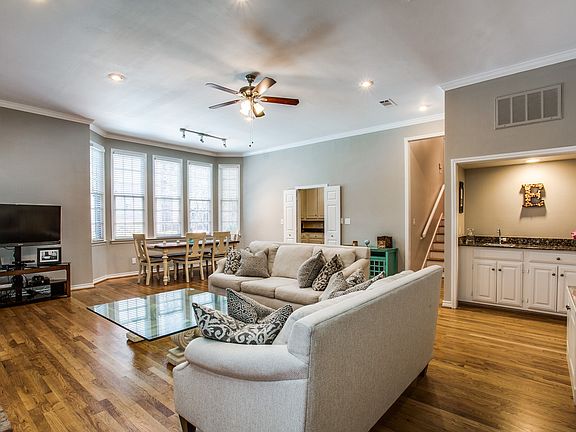 Located just blocks from Whole Foods, this Oak Lawn condo has the ideal location, finish and value. A corner residence, the first floor living space receives an abundance of light from two sets of French doors and a bay window overlooking private community pool. The open living area also includes woodburning fireplace, high ceilings, hardwood flooring, a wet bar and recessed lighting. The adjacent kitchen has been updated with white cabinetry, stainless steel appliances and granite countertops. Upstairs, the master boasts a second fireplace and a bath with double sinks and separate shower and tub. The cozy upstairs study gives the home added character and could function easily as home office or den.