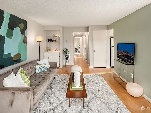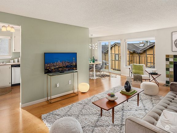 A rare offering in this boutique building of 7 units nestled in the convergence zone of your favorite hoods - Fremont, Phinney & Ballard! Move-in ready SW corner unit w/ welcoming bamboo floors, new carpet & wood-burning fireplace. Revel in the epic sunsets & coveted Olympic Mountain view from the west-facing balcony. Featuring a generous primary suite, a 2nd sizable bedroom, in-unit W/D & storage. With a garage & driveway parking (2 spots!), say goodbye to circling the block ever again. Uber convenient location w/in blocks of Lighthouse Roasters, Marketime, Reuben’s, RockCreek & Paseo. Near bus lines & 99 for an easy commute, or roll 3 miles to SLU/Downtown. Outdoor urban adventures await w/ Woodland Park & Green Lake steps from your door.