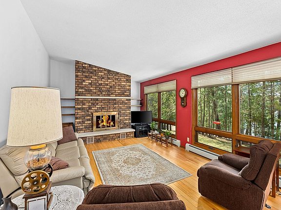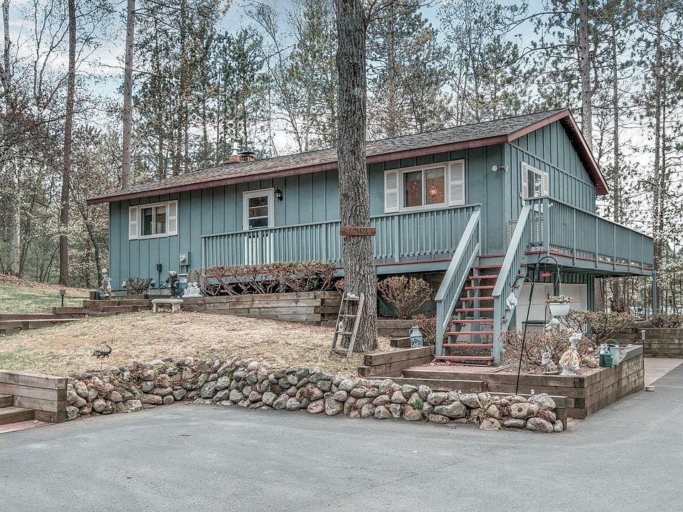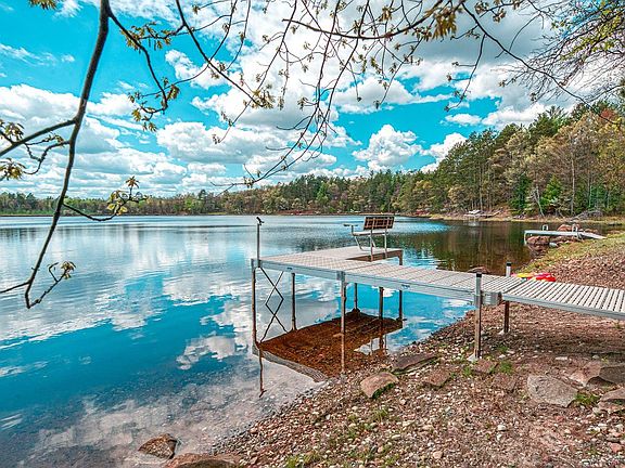 On Golden Pond. This like new 2-bedroom 2 full bath Wildwood Lake Home with 347 ft of sand frontage, 1.8 acres of land, a wraparound deck and 2 car heated garage. The kitchen, dining area and living room are all open and on the lakeside with gas fireplace, access to the wrap around deck, beautiful hickory flooring, Hickory kitchen cabinets, breakfast island, pull out spice rack, stainless steel appliances, & a wonderful lake view. The two bedrooms fill with natural daylight and have hickory flooring. The full bath on this level has a tub shower unit with a door to the master bedroom and hallway. The walkout lower level has a mostly finished rec room, a free-standing gas stove, Laundry/full bath with a shower unit, and room for more storage. Enjoy beautiful sand beach frontage, crystal clear water, western exposure with great sunsets, & 3 separate wooded lake front lots. The raft, paddle boat, rowboat, dock, & lawn swing are included. Buyer to supply fishing pole & swimsuits.