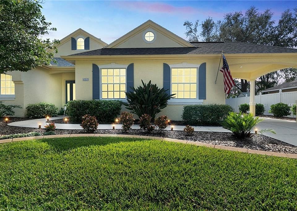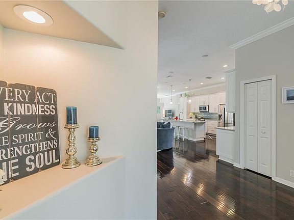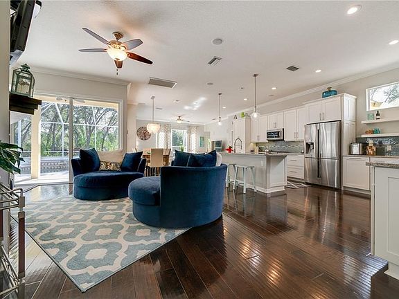 This recently transformed show-stopper home is better than a model home in a new community! The 3BR/2.5B home WITH DEN has a modern, OPEN CONCEPT floor plan in a well-established boating community with no CDD! Features include a central kitchen with huge quartz island overlooking two living areas, fireplace, and out to the inviting patio and POOL area. The kitchen has plenty of cabinet space and counter top space highlighted with custom & lighted glass-front cabinetry. The all new upgraded stainless steel appliances include an apron sink and both a wine refrigerator and beverage center. This home has a BRAND NEW ROOF, all new lighting and ceiling fans, all newer interior and exterior paint, crown molding, hand-scraped walnut floors, and a five-in-one surround sound system with a speaker system in living area, master and poolside. The split plan master bedroom steps out to the pool area and the master bathroom has a walk-in shower, jetted tub, and a wall of windows with custom plantation shutters. The guest bathrooms were updated with new vanities and quartz tops. Step out to the patio through disappearing corner sliding doors and enjoy the large covered space, saltwater, natural gas heated pool and spill-over hot tub. The cage was newly screened and there is an outside fenced dog run. The Inlets at Riverdale is close to it all, including world-class beaches, restaurants, shopping, I-75, I-275, US301, and US41! Do NOT miss this beautiful model-like home!