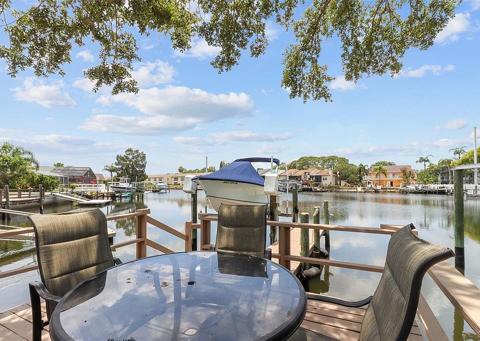 BIG PRICE IMPROVEMENT! WATERFRONT! GOLF CART FRIENDLY all the way to downtown New Port Richey!! BEST VALUE ON THE WATER from GULF HARBORS, GULF HARBORS WOODLANDS to FLOR A MAR. Keep your boat on the 10,000LB BOAT LIFT in your backyard. Cruise to the GULF OF MEXICO from the DEEP WATER COVE with NO FIXED BRIDGES. Gulf Harbors PRIVATE BEACH and YACHT CLUB are both available for an additional fee. The best part is that all this comes with a house! The open floor plan boasts updates throughout, including NEW PEX PLUMBING PIPES with a 25 YEAR WARRANTY. The bright, modern kitchen with granite countertops flows to an eating nook that overlooks the cove. Spend time unwinding with the tranquil Koi Pond and fountain. Retreat to the master suite, which includes two walk-in closets, double sinks, and views of the water! The second bedroom offers a spacious sanctuary. The third room is a 10x12 BONUS ROOM spacious enough to be what you need; bedroom, office, or whatever works for you! The NEWER HW HEATER (2022), AC (2021) and ROOF (2015) will give you peace of mind. The community features a clubhouse, pool, tennis courts and private boat ramp.