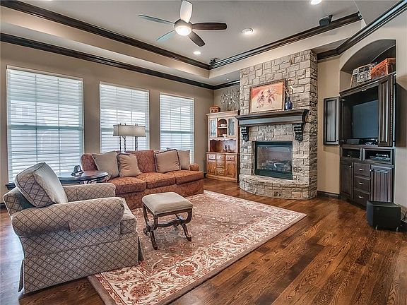 This stunning home has so much to offer. Open living and kitchen with large breakfast bar, granite counter with a center island that has its own vegetable sink, the counter and cabinet space would please any cook. Gas stove plus 3 ovens, built-in microwave, a large walk-in pantry with spice rack in the door. Large living area with real wood floors, stone fireplace, built-in entertainment center, Hunter Douglas Silhouette shades. The formal dining has the same beautiful wood floors. Large office with built-in bookcases just off the master suite that can also be a bedroom, master has a setting area with Hunter Douglas Roman shades, access to a private patio, whirlpool tub with separate walk-in shower, double sinks, and his and her closets. Laundry room boast a sink, cabinets and lots of counter space. The bedrooms upstairs are nice size with walk-in closets. Each bedroom has access to their own bathroom. Two living/bonus rooms as well. Beautiful landscaped backyard.