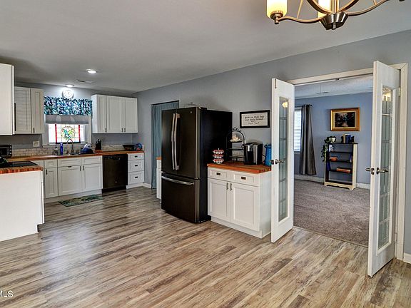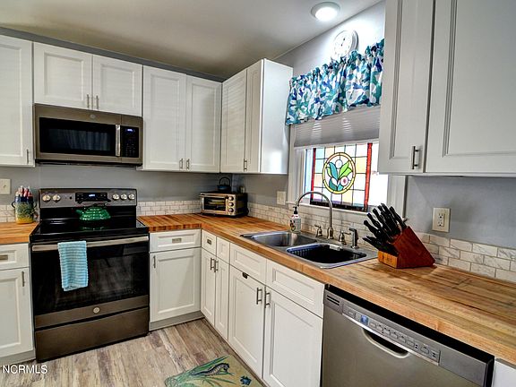 The open-concept living space with luxury vinyl plank flooring and fresh paint contributes to a contemporary and welcoming atmosphere. The updated kitchen, complete with wood-block countertops, high-quality soft-close cabinets, and black stainless steel appliances, adds a touch of luxury. The inclusion of a dual convection/conventional oven is a nice detail for cooking enthusiasts. The brick fireplace with cast iron fireplace insert will keep you warm and cozy. The backyard concrete patio would be great for an outdoor kitchen.