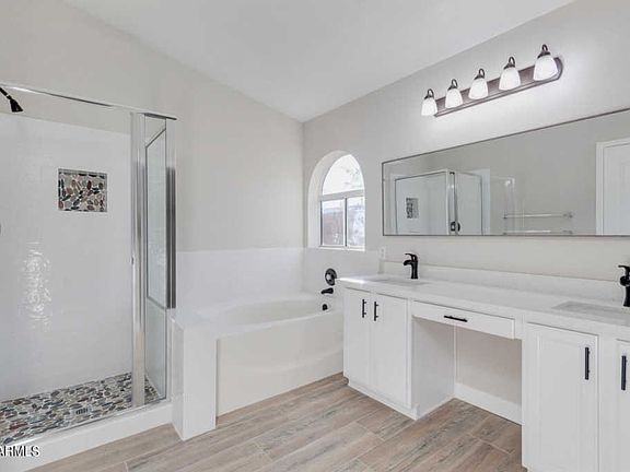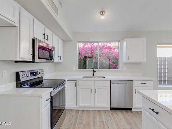 This beautifully remodeled home in Phoenix is the one you have been looking for! Fantastic interior greets you with a bright living and dining area with gorgeous chandelier, bay windows that bring in lots of natural light, vaulted ceilings, dreamy wood-like tile, 3 roomy bedrooms, and 2 spotless bathrooms. Gleaming kitchen is a cook's delight with sliding-door pantry, centered island with breakfast bar, and high-end appliances ready to be used. The main bedroom comes with a luxurious bathroom including glass step-in shower, a tub ideal to relax in after a busy day, dual vanity with track lighting, and walk-in closet. Enjoy your gatherings in this incredible grassy backyard with paved and covered patio.