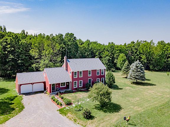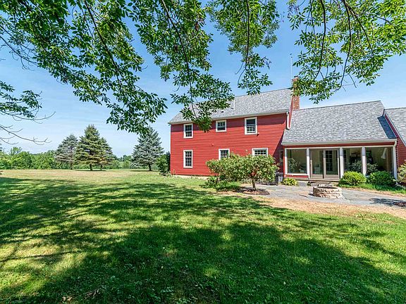 Open Sky and Views! This reproduction colonial with 5 bedrooms and 2 baths on 16 acres is a unique offering. Fields and meadows lead to the house on the hill and wooded acres offer private walking paths. Enjoy the welcoming living room with wooden ceiling planks and beams and brick fireplace with paneled wall and built in shelving. Glass doors lead to the 20 foot long sun room making nature part of the house at the start. The patio with built-in fire-pit are just steps away for your enjoyment on warm and cool nights!The kitchen has been recently upgraded with all new cabinetry, counter tops and soap stone sink. The formal dining room has wainscoting and chair rails to make the colonial style prevail. There are two additional office/den/bedrooms on the main floor. The 2nd level has the master bedroom with bonus room attached, hall bath and three additional bedrooms. Recent upgrades include roof replacement, high efficiency windows and siding . Great home for active people or for relaxing on the quiet 16 acres you can call home. Showings are delayed until Saturday August 1.( All measurements approximate)