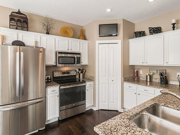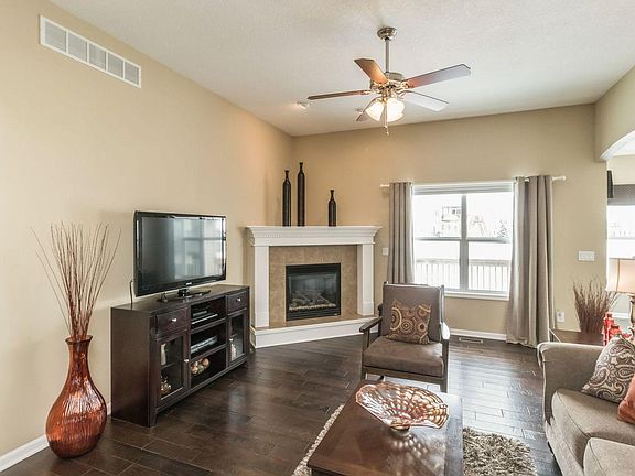 "New-sizing" with carefree detached single family association home in quiet, sought-after location. This home has all the thoughtful touches, large front porch with railing, 3 bedrooms up, deep rich hardwood floors, bright open east facing eat-in kitchen with access to deck, warm fireplace in great room, huge master suite, convenient main level laundry. Attached generous two-car garage. Home faces west for faster driveway melting AND great shade on east facing deck for coffee while watching the pond with fountain. Then see the awesome lower-level finish: office/bedroom, bathroom, eat-in kitchen area, buffet kitchen with serving access, huge main great room area with additional seating for game table/dining for family and friends. This home offers all the benefits of stand-alone home with the added benefit of an excellent well-run association for lawn, snow and freedom from exterior jobs to do Incredible See this one for sure.