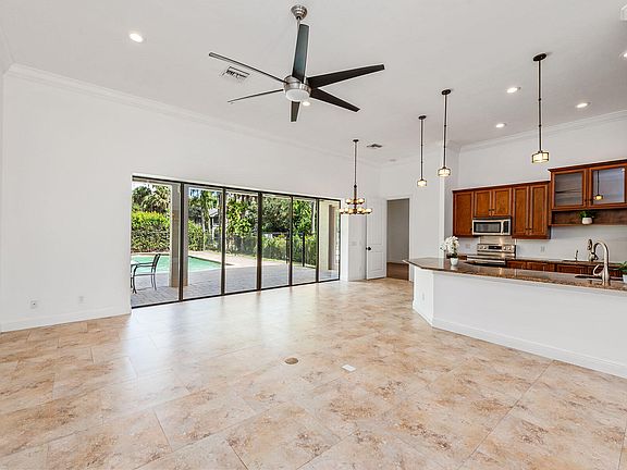 Sprawling over an impressive 1.14 acres, this property accentuates luxury, space and privacy. A long driveway leads to the main residence boasting three bedrooms with a den, 2.5 baths and a two-car garage. Inside, you'll be captivated by soaring ceilings, pristine tile flooring and intricate crown molding. The open living area is heart of the home, seamlessly connecting the outdoors where a sparkling pool awaits. The gourmet kitchen with its granite countertops, newer dishwasher, and three-seater breakfast bar has been designed with not one but two cooktops and sinks. Elevating the luxury is the primary suite offering private lanai access, spacious walk-in closet, and a spa-like en-suite bath featuring dual sinks, bidet, multiple heads walk-in shower and a separate deep soaking tub. If the main residence wasn't enough, the property boasts a separate one-bedroom, one-bath guest house complete with a living room, kitchen with newer refrigerator and a two-car garage. Additional perks include well irrigation and a security system. Just a stone's throw from Naples fine dining, luxury shopping and pristine beaches, yet tucked away for serenity.