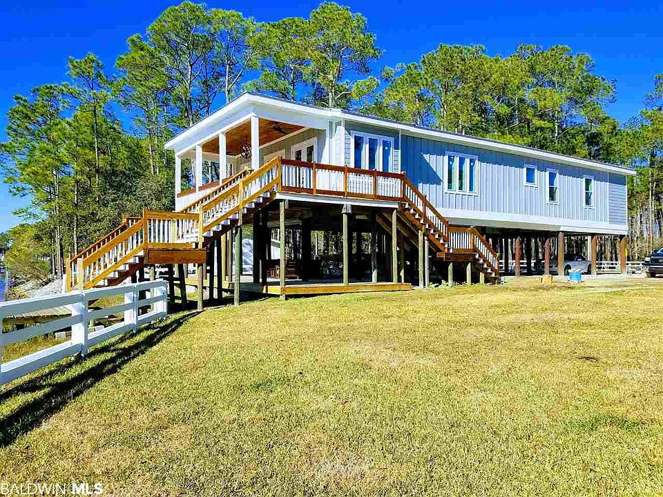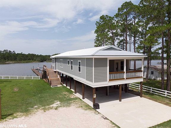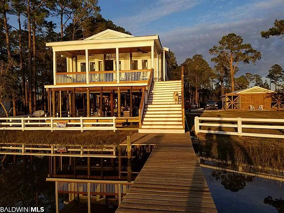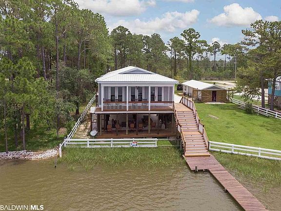 Featuring 100' of waterfront, new custom built home enjoys spectacular westerly riverfront views of the Bon Secour River. As you enter this property you are drawn to the water view along with the 75' dock with boat lift all ready for your enjoyment. A separate garage can be utilized for vehicle or boat storage and includes an adjoining multi-purpose room that can be used to meet your needs. Where you will really appreciate this home is when you enter the home through double french doors and see the light infused, open concept living area that includes the main living area, dining room and kitchen. Surrounded by soaring ceilings and large windows, you are able to appreciate the spectacular views from everywhere in this home. Finished with an impeccable attention to detail this home will feature "wood look" ceramic tile flooring, custom trim work throughout, gorgeous chandeliers and fixtures. The river front portion of the home features a kitchen that any chef would envy, opening to the dining and living area. Continuing outside the dining and living area open through french doors to an expansive deck making this a perfect home for the entertaining enthusiast or perfect for the person want to escape and enjoy the peaceful, natural beauty of riverfront living. As you enter the luxurious master suite you once again enjoy the soaring ceilings with views of the river, a private deck (with elevator) off the master bedroom create your own little private retreat that is completed with a spa inspired en-suite bathroom. Two additional generously sized guest bedrooms share a jack-n-jill bathroom. Enjoy all these features while living in the Gulf Shores City School District, be less than 10 minutes from dining, entertainment, shopping, trails and beaches all while feeling like you are on an endless vacation! Don't miss this opportunity to make this your home! ( Elevator Optional )