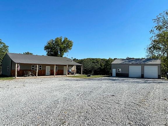 Country Living for Sale in Cedar County.El Dorado Springs Country Home and 5 acres for Sale. This 1500 square foot farmhouse style metal home is roomy and functional. Ten-foot-high ceilings throughout this one level home give a spacious feeling. The large kitchen has plenty of cabinets, an eat-at island, and a walk-in pantry for extra storage. While the home is equipped with central heat and air, a wood burning stove in the dining area provides extra warmth and reduced utility costs in the cooler months. The living room is also big with plenty of space to host or entertain. The home has 2 bedrooms and 2 full bathrooms with another non-conforming bedroom or office. Rustic cedar beams support the roof of the large covered front porch which provides plenty of space to relax with a cup of coffee in the cool mornings or lemonade in the warm afternoons. Outside the home is a large yard separated from the rest of the property by a fence. A garden spot behind the home will allow the owner to grow their own produce. The 30'x40' shop has a concrete floor, electric, an office area, and two bays with 10'x10' doors. The property is mostly pasture with a few scattered trees and a small pond and is completely perimeter fenced, perfect for cattle or horses. A fresh load of gravel has been spread over the driveway and parking area in front of the home. The home has recently been upgraded with high-speed fiber internet service. This attractive property just a few miles from town will sell quickly so call today to schedule your showing!