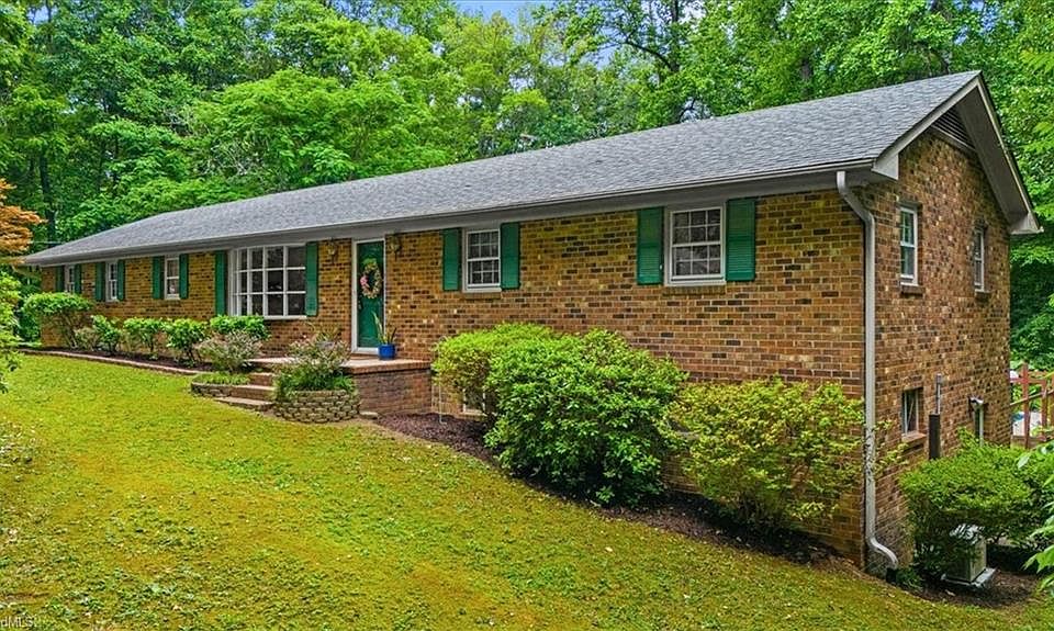 Welcome home to your brick ranch with tranquil countryside living nestled on a 1.6 acre corner lot plus basement too. Updated kitchen boasts beautiful cabinetry, granite ctops, backsplash, large pantry, center island with bar stool seating & another area for breakfast room or ML office space if needed. Den with masonry fireplace, living with bright picture window, many wood floors on ML including all 3 bedrooms AND both baths updated w/tile floors & glass doors; primary ensuite w/walk-in shower. Attached carport with storage/workshop space, large deck area that overlooks inground pool & cabana; all great for enjoying outdoors & entertaining friends & family! Basement open for many possibilities like recreation, workout, dry bar. HVAC & basement mini split '22, H2O '24, property has a creek that leads to pond partially on this lot, no HOA dues, USDA eligible & located just a short drive to Greensboro, Asheboro, Burlington & Toyota Megasite. Hurry to make your private tour today!!