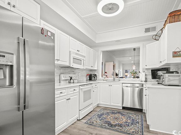 A rare find! Simply stunning and one of a kind villa in Lightkeepers of Village in Little River. 3 BR/ 2 BA first floor end unit located in a peaceful setting overlooking the pond and just steps to the marinas and Intracoastal Waterway. This exceptional home boasts an open floor plan with volume ceilings, sizable rooms, abundant storage, and an extraordinary wrap around screened porch overlooking the pond. Enhancements include bead board and smooth ceilings throughout; luxury vinyl flooring; designer lighting and fans; electric fireplace in living room (for aesthetics and heat); solid surface counter tops in kitchen and baths; deep single bowl stainless steel sink in kitchen; huge linen/storage closet in primary bath; exquisite primary bath walk-in shower and dual sinks; newer refrigerator, washer, and dryer; comfort height toilets in both baths; epoxy screened porch floor; deep crown moulding throughout; new door and cabinet hardware; reglazed guest bath tub/shower, and more! There is access to different areas of the screened porch from both the living room and the primary bedroom. Community amenities include pool, clubhouse (with small fitness room), and newly renovated boardwalk along the Intracoastal Waterway and marina. Shopping, restaurants, golf, and medical facilities are also near by. These don't not come along very often so do not miss this opportunity! Measurements are approximate and not guaranteed. Buyer is responsible for verification.