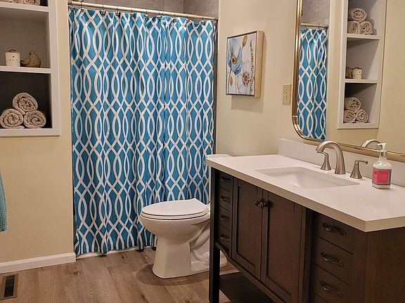 Remodeled Primary bathroom and bedroom. new floor, shower, toliet, vanity, lighting and ceiling fan with Walk-in closet! tenant pays all utilities, mowing and trash