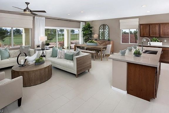 May Completion! Plan 3 in Valencia at Mountain Falls is a beautiful single story floor plan that features 3 bedrooms, 2 bathrooms, a flex room, and 1,984 square feet of living space. The largest of the Valencia floor plans, this home is sure to please. The foyer brings you past 2 secondary bedrooms and the flex room, which will make for the ultimate space to work from home or turn into a playroom for the kids. As you continue through the home, the open kitchen with island and great room becomes the perfect place to gather and entertain family and friends. Enjoy the beautiful Nevada weather from your private outdoor patio or relax in the primary bedroom featuring a private bathroom with double sinks and large walk-in closet. Structural options include: 8’ front door, 12’ center meet sliding glass door, and covered patio at the great room.