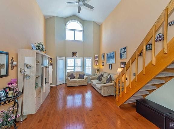 Rare opportunity to own one of over-sized top floor units in the Bergenwood Condominiums. This 3 bedroom, 2 bath unit has beautiful 18' in cathedral ceilings and great natural lighting. First floor features an updated eat-in kitchen with granite counter tops and stainless steel appliances, spacious living room, and two bedrooms with en-suite baths. Lofted 3rd bedroom or home office upstairs. Additional features include top/bottom in-unit laundry, terrace, central A/C, and 1 car parking. Located less than 5 miles from NYC port authority for an easy commute and within blocks to public transportation, local shops and stores, schools, and parks. Don't miss this one!