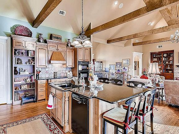 Remarkable traditional ranch-style home, with an over sized master-on-main suite, tray ceilings, enormous walk-in closet; elegant tile shower with double-head spouts and Jacuzzi with custom built-in cabinets for additional storage. Open kitchen concept overlooking the family room; easy access to the large inviting back porch overlooking level backyard. Custom built cabinets in kitchen, built-in oven, microwave & warming drawer; enormous GOURMET kitchen island; Beautiful exposed beams highlighting the warm ambiance in the family room; LARGE separate dining room; 3 additional bedrooms on terrace featuring another custom kitchen and open entertainment area. 2 add'l bathrooms on terrace to accommodate entertaining purposes.