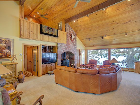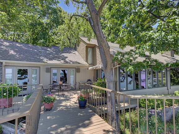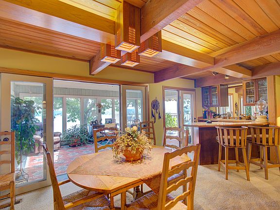 Custom designed and built by Joe Wilkinson, the architect, this 2 level 4 Bdrm, 4 bath home has an excellent mainlake view. The home has many sopecil features, including an outdoor water fall w/ creek bed, hardwood floors, beamed and wood ceiling, Sante Fe Tile in kitchen , a Lg all- season rm viewing the lake, primary suite w/ 2 bath's, main level guest rm, upper level bunk rm/ game rm, & another Bdrm,Frank Loyd Wright details, side fenced yard, crow's nest deck viewing the lake to the East. Nicely landscaped. Well anointed.