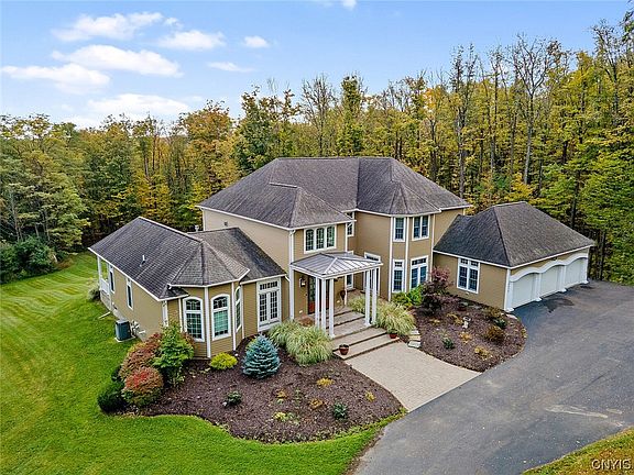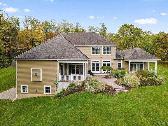 Magnificant 6500+ square feet of architectural masterpiece and ultimate luxury w/over 4 acres of sprawling private land features a grand marble entrance foyer, circular driveway, stunning pillars throughout, cherry wood staircase w/wrought iron spindles. Stylish gourmet kitchen w/double islands, butler's pantry, granite counter tops, walk-in pantry & travertine tiles. Wet bar with seating area, wine cooler, dishwasher & refrigerator. Tray ceiling in great room, family room, primary bedroom and breakfast room. Designated office area. Lavish first floor primary ensuite w/his & her vanities, walk in closet. Finished walkout lower level for in-law's quarter. It has second fully equipped kitchen. State of the art home theater/media room. All designer light fixtures throughout. Reminiscent of a boutique hotel from Tuscany villa with a modern fusion. This majestic crown jewel of Onondaga Hill is located across from Community General at Upstate Hospital, minutes to downtown and can be yours for this holiday season and beyond.