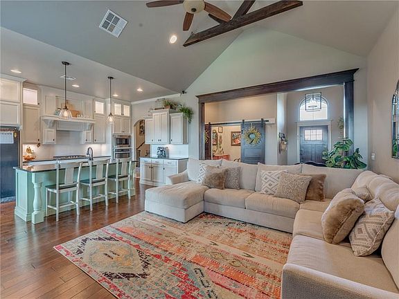 Beautiful home with all the details to love!! Inviting open floor plan with vaulted ceilings and gorgeous stone fireplace in living. Wood floors in living, kitchen, and study. Kitchen features include 3m granite countertops, granite composite sink, above & under cabinet lighting, soft close hinges. UPSTAIRS BONUS ROOM with half-bath includes projector screen, surround sound, microwave, and mini-fridge. Both downstairs bathrooms are equipped with bluetooth speakers. Satin paint & real wood blinds throughout home. 7 camera wired security system and Ring doorbell. Garage has epoxy flooring and in-ground storm shelter. Tankless hot water heater. Exterior features: guttering around full house, fully fenced, sprinkler system, outdoor gas fireplace, asphalt shingles, front flowerbed w/ custom curbing. This is a dream home! Book your private showing today!