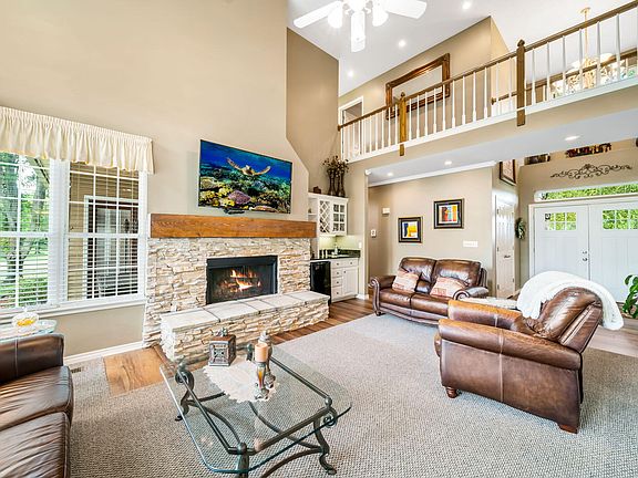 Stunning home on the golf course at The Coves featuring 4 bedrooms and 3.5 baths. Enjoy plenty of room to entertain on the patio with a big screen tv for the football games or in the great room with a fire in the fireplace, open to the kitchen and bar area. This beautiful home sets on a corner lot and backs up to a green belt. Fresh paint on exterior just last year. New exterior lighting. Spacious pantries adjacent to the kitchen, wet bar and mini frig in the living room. Primary bedroom with walk in closet, all on main level. Formal dining room awaits you near the kitchen and living room. Laundry room has plenty of spacious shelving and room for hanging up laundry. Tons of natural light flowing through the beautiful windows throughout the house. Amenities include pool tennis, practice range, clubhouse and workout room. The golf course awaits you with great plans for the family or corporate packages. New restaurant at the Pro Shop. There is plenty of parking with a 3 car garage and oversized driveway parking. GV*