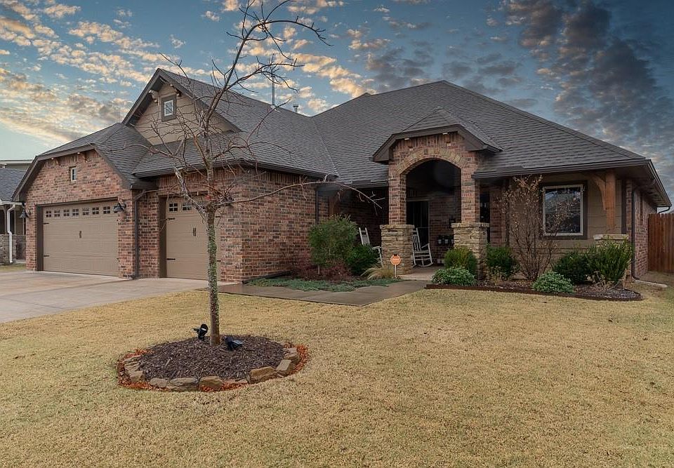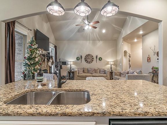 This absolutely stunning just like new home is awaiting its new owners! Living room showcases tall cathedral ceiling, beautiful fireplace with stained woodwork, and windows on either side allowing natural light to flood the room. The wood like tile sweeps through the entry, to the living room, kitchen and continues in the hallway to the secondary bedrooms.The kitchen is a chefs dream, with granite countertops, large center island, stylish tiled backsplash, stained cabinetry, and breakfast bar. Split floor plan allows the privacy of the Primary bedroom on the opposite side of the home from the three secondary bedrooms.The primary bedroom includes a raised ceiling and large window that really opens the room up and complete with a private en-suite featuring a double vanity, tiled walk in shower, separate tub, and walk in closet. Work from home in the study or use this space as an additional bedroom. Keep everyone safe with the above ground safe room in the garage. This home is a must see!