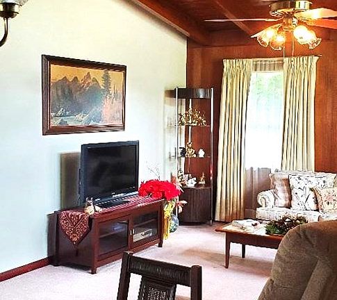 This cut midcentury home has original beamed ceilings in the dining room, living room, kitchen, and 3 bedrooms. The Kitchen has a built-in Dishwasher, a Breakfast Bar, and a Refrigerator, which is included. The primary bedroom has a half bath, and the Living/Dining room has sliding glass doors that open to the private covered porch. There is also a patio out back.