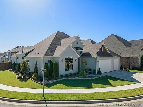 This 2-year-old stunning 1-story ranch style home (no stairs), situated on a corner lot nestled in the highly desirable gated community of Wind River Crossing, located within the Jenks school district and just minutes from Riverside, Jenks, River Parks, and Tulsa Hills! Enjoy all the benefits of luxury, safety, and new without the time & cost expense of adding custom upgrades. This full brick home includes numerous upgrades and finishes, including high ceilings, a tornado/Family Safe shelter, Generac whole house natural gas generator, foam attic insulation, and professionally landscaped yard complete with commercial lighting. Upon entering the home, the light hardwoods, bright windows, and shiplap accents coupled with the inviting fireplace enhance the appeal of this open concept home. The open main living area flows seamlessly into the dining space and a stunning chef's kitchen complete with an abundance of cabinetry, high-end kitchen appliances, 5-burner gas cooktop, custom vent/hood, and a large walk-in pantry with a dry bar and wine chiller. Just beyond the kitchen, you'll find an expansive laundry area and highly functional mud room. The primary bedroom serves as its own luxurious oasis complete with a private spa-like primary ensuite including a deep soaking tub, separate oversize walk-in shower, dual vanities, and a large walk-in closet. Three additional generously sized bedrooms each with their own bathroom serves as personal and relaxing retreats to enjoy in privacy and comfort. This whole home, top to bottom, features attractive custom lighting fixtures, quartz/granite counters, hardwood floors, interior designer selected paint scheme, custom landscaping, and so much more. The homeowners have truly spared no expense in further enhancing and upgrading this home throughout. A rare find, this home is a perfect showcase of South Tulsa living, where refined elegance, luxury, and safety meld together to reflect a comfortable yet elevated lifestyle.