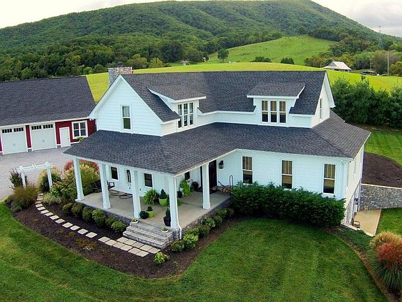 CUSTOM BUILT CONTEMPORARY STYLE FARMHOUSE FEATURES MOUNTAIN VIEWS IN A PASTURAL SETTING. COVERED FRONT AND REAR PORCHES; 9' CEILINGS, WHITE OAK HW FLOORS, SOLID WOOD INTERIOR DOORS AND SO MUCH MORE! VAULTED METAL CEILINGS ENHANCED BY CONTEMPORARY STAIRCASE W/STAINLESS CABLE RAILING; GREAT ROOM W/WOOD BURNING FIREPLACE, DINING AREA, OPEN KITCHEN W/CUSTOM WOOD CABINETS, CONCRETE COUNTERS, STAINLESS JENN-AIRE GAS COOKTOP, DOUBLE OVENS, FARMHOUSE SINK; OFFICE W/BUILT-IN CABINETRY; ENTRY LEVEL MASTER SUITE; MASTER BATH W/TILE WALK-IN SHOWER, AIR TUB, DUAL VANITIES, WALK-IN CLOSET; UPPER LEVEL OFFERS 2ND BEDROOM ENSUITE, 2 ADDITIONAL BEDROOMS, 3RD FULL BATH; WALK-OUT LOWER LEVEL TO BEAUTIFUL POOL.