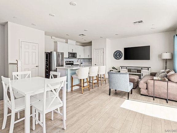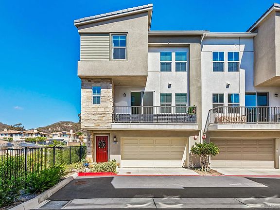 Fantastic Views! Enjoy this tastefully appointed hilltop townhouse, perfectly situated to take advantage of the great views and wonderful breeze. Immaculate end unit with great location & views. Save with energy efficient home and owned solar. Open floor plan concept in the main living area. Large gourmet kitchen with Quartz counter tops, stainless appliances, plenty of cabinet & counter space, pantry, large 4x7 island with sink, comfortably seats three. Plenty of natural light, 9 foot ceilings, large sliding glass door leading to balcony, recessed lighting, and Luxury Vinyl Planking flooring. The two upper bedrooms both feature an en-suite bathrooms, dual sinks in the primary bedroom, laundry on upper level also, with cabinets for storage. 2 car garage, & central AC. Viewpointe features a park, BBQ area, playground, & dog park. Home is conveniently located close to Palomar College, Cal State San Marcos, schools, dining, shopping, medical centers and nearby freeway access.