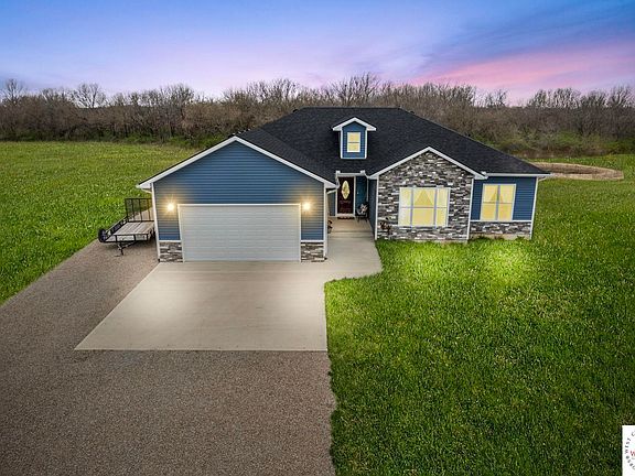 Introducing a stunning home crafted with the utmost attention to detail, perfect for those with discerning taste. This meticulously maintained property, constructed in 2022 and sparingly utilized, offers nearly 3000 square feet of luxurious living space. Step inside to discover three electric fireplaces, each capable of enchanting color changes, adding warmth and ambiance throughout. With nine-foot ceilings gracing both the main floor and basement, the sense of grandeur is unmistakable. The main living room features vaulted ceilings, a precursor to the expansive gigantic deck spanning 56'x12', providing captivating views of the sprawling nearly six-acre estate. Your very own oasis awaits, just a mere 5 minutes from Whiteman Airforce Base. Experience the extraordinary as B2s and Fighter jets grace the skies above, offering a unique spectacle visible from your doorstep. The walkout basement offers a second living space, complete with a built-in projector wall and surround sound system - an entertainment enthusiast's dream. Additional features include an unfinished basement safe room and an extra garage, ideal for storage or workshop space. A gravel RV pad with hookup adds convenience for outdoor enthusiasts. Plus, enjoy custom-built Amish Cabinets, Granite Countertops, and a Bluetooth shower speaker in the Master Bath, adding luxury and functionality to this exceptional home. Surrounded by just enough timber to attract wildlife, enjoy serene mornings or indulge in afternoon target practice. Don't miss out on this exceptional opportunity. Schedule your viewing today and make this unparalleled property yours.