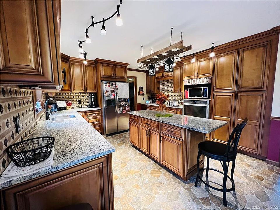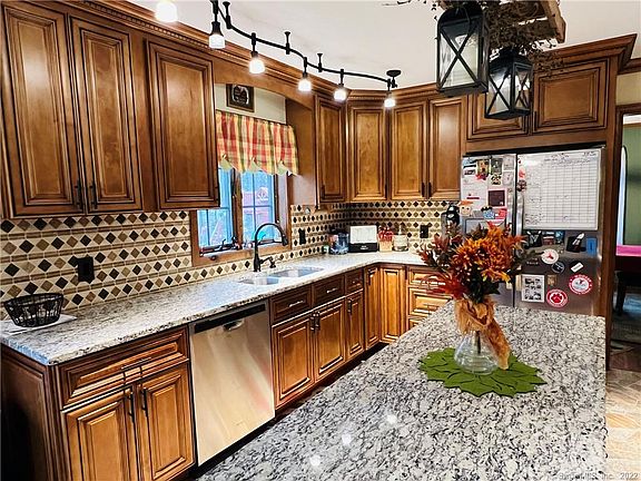 STONEWALL boundary and LONG PAVED driveway leads to this BEAUTIFUL SPRAWLING GAMBREL w/ $35,000 NEW VINYL, GUTTERS AND trim! Gorgeous $25,000 CUSTOM kitchen w/ STAINLESS APPLIANCES, GRANITE COUNTERS and large ISLAND w/ BREAKFAST BAR next to ANDERSON SLIDER leading to DOUBLE DECKS, POOL, HOT TUB for entertaining. CEILING TO FLOOR BRICK FIREPLACE in SPACIOUS living room, FORMAL DINING room w/ BAY window, 1/2 bath w/ GRANITE VANITY. BREEZEWAY has laundry area next to 24 x 22 OVERSIZED 2 car garage. NEW CARPET on STAIRS leads to PRIMARY SUITE on one side w/ 3 closets and its own bathroom and 24 x22 HUGE BEDROOM or FAMILY room w/ BALCONY on opposite side overlooks the 1.56 ACRES. 2 additional bedrooms (NEW CARPET) and FULL bathroom w/ GRANITE VANITY in the middle. Lower level has a HUGE HEATED playroom, full bathroom and an office. 2015 BUDEROUS BOILER and HOT WATER HEATER, 2013 ROOF, LARGE SHED w/ NEW VINYL perfect for tractor and toys w/ garage door and a LOFT above will convey.