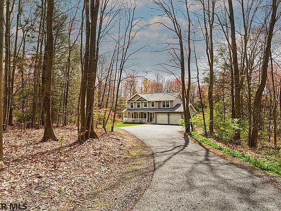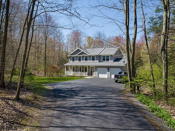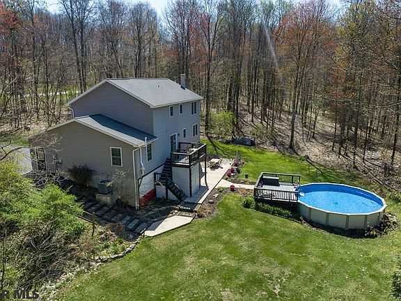 For those that love the great outdoors. This lovingly cared for 2-story is perfectly positioned on 7.22 secluded acres offering a fire pit, batting cage, 4-wheeler paths & shooting range. 3 full levels of living space, updated eat-in kitchen with granite countertops, tile backsplash & a slider to rear oversized deck overlooking the private backyard & above ground pool. The first floor bedroom is perfect for guests, half bath, living & dining rooms plus a handy mudroom leads to the 2 car garage. Upstairs you will find the owners suite with large walk-in closet, private full bath with Jacuzzi tub. There are 2 bedrooms, another full bath & a convenient 2nd floor laundry room. The finished walk-out basement delivers the perfect space for entertaining on game day. There is a wet bar, pellet stove, home office, full bath & walks out to the rear patio. Pie shaped property is bordered by large tracts of woods so wildlife is abundant. The perfect property for the active household.