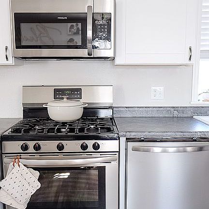New Stainless appliances, including refrigerator, gas stove, over the range microwave and dishwasher