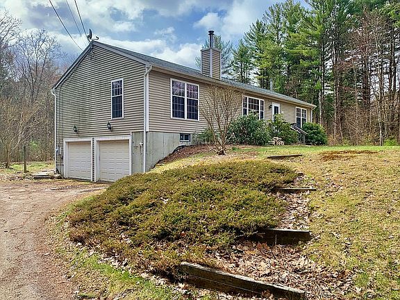 Immersed in nature with homestead potential, yet only 12 minutes drive to center of Amherst. Call us to see! 413-253-4817 or email matthew@yogacenteramherst.com ~~~ Enjoy quiet, peaceful country living on this 2.5 acre landscaped lot bordering creek/small pond. Sunny and bright master bedroom with cork flooring, two closets, large bathtub, and walk in-shower. Two additional bedrooms with cork floors and big windows next to another full bath, and the finished, heated walk-up basement can easily be a fourth bedroom, den or office. Woodstove makes the whole main floor super cozy in winter - basement is on a separate heat loop. Main floor has a very open feel, with connected kitchen, dining, and living rooms. Living and dining rooms have oak floors, and spacious kitchen has a new deep-basin sink and beautiful quartz countertops. Sunny back porch - great for year-round barbecuing and three-season sun-soaking, is conveniently right off the kitchen. Attached two car garage with new automatic doors opens to a large mud room with closet. Big garden for growing food and flowers, and bigger yard, plus wooded trails and even a tent platform and fire-pit just inside forest. Rooftop solar possible. Excellent elementary school just down the road and older kids would go to Amherst Middle and High School.