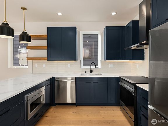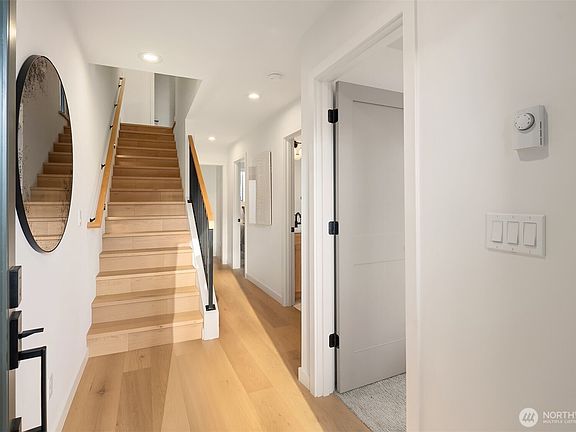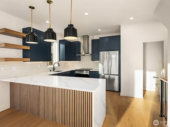 Discover modern elegance in the heart of vibrant Wallingford with this Ecoworks Homes masterpiece. This new construction stuns with its sleek design, expansive floor-to-ceiling windows, and warm, sophisticated finishes. The chef’s kitchen boasts stainless steel appliances, custom cabinetry, and a spacious peninsula island—perfect for hosting or casual meals. The main floor offers two versatile bedrooms and a full bath, ideal for guests or a home office. Upstairs, the primary suite indulges with a spa-like ensuite and ample laundry space. Breathtaking city views from your private rooftop deck. With EV-ready parking and steps from Gasworks Park, local eateries, and boutique shops, this home blends luxury with unbeatable convenience.